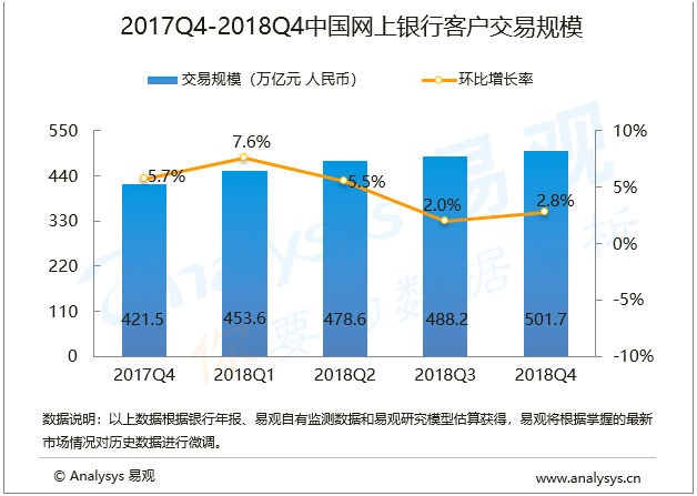 根據Analysys易觀產業(yè)數據庫發(fā)布的《中國網上銀行市場季度監(jiān)測報告2018年第4季度》數據顯示,2018年第4季度,中國網上銀行客戶交易規(guī)模為501.7萬億元人民幣,環(huán)比增長2.8%。