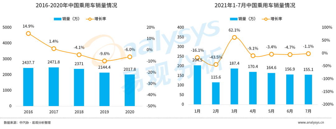 2018年起,受宏觀經濟環(huán)境變化、共享出行的發(fā)展、用車環(huán)境的惡化、人口變化等結構性因素的影響,中國汽車消費市場進入存量博弈階段,乘用車銷量呈持續(xù)下降趨勢。2021年國內宏觀經濟持續(xù)復蘇,整體汽車消費市場開始回暖,但芯片短缺,疫情反復給未來汽車市場走勢及經銷商盈利情況帶來了諸多的不確定性。