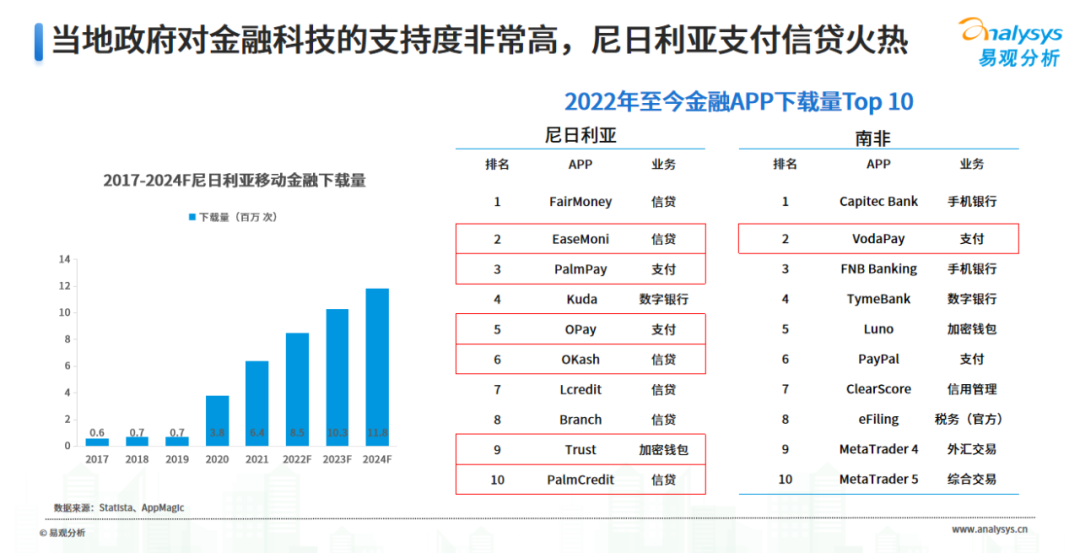 從數(shù)據(jù)來看,2020年后尼日利亞的移動金融下載量開始井噴,同時由于尼日利亞很多人沒有享受到傳統(tǒng)銀行服務(wù),當(dāng)?shù)卣浅OM柚萍嫉牧α孔尭嗳讼硎芙鹑诜?wù)。