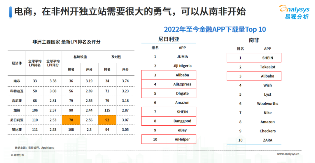 劉怡表示,電商最重要的基礎(chǔ)是支付和物流。正如前面所提及的,支付在南非已經(jīng)比較成熟,尼日利亞也有很多服務(wù)商。而在物流方面,易觀分析參照目前最新的LPI*來看,前面提及的幾個大國均為非洲排名較前的國家,其中南非最好,排名33。