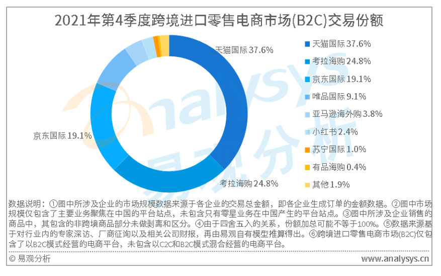 2021年第4季度各大平臺(tái)交易份額仍然有一些變化:天貓國(guó)際排名第一,份額為37.6%,所占份額有所上升;考拉海購(gòu)排名第二,份額為24.8%,所占份額環(huán)比有較明顯下降;京東國(guó)際排名第三,份額為19.1%,所占份額環(huán)比明顯上升。